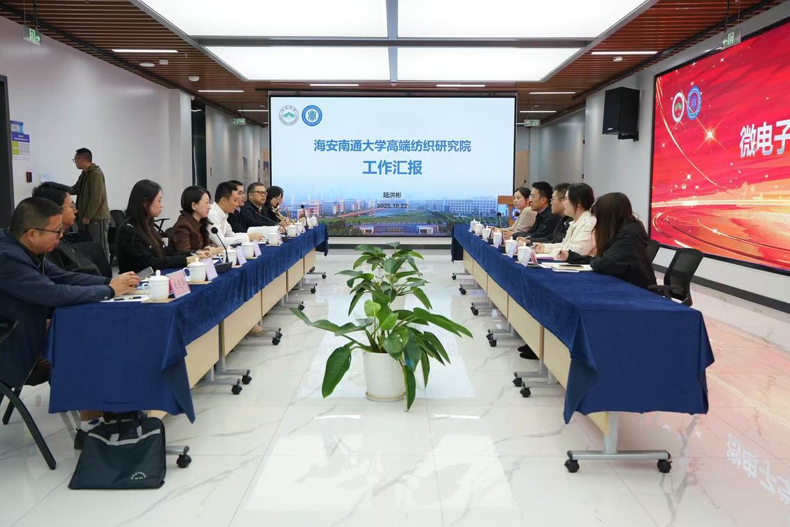 10 月 22 日上午,老虎机线上 党总支书记金翼、副院长(主持工作)赵继聪带领班子成员及科研骨干等前往海安南通大学高端纺织研究院,就研究院建设规划、科研工作推进、产学研协同合作等内容开展学习交流。